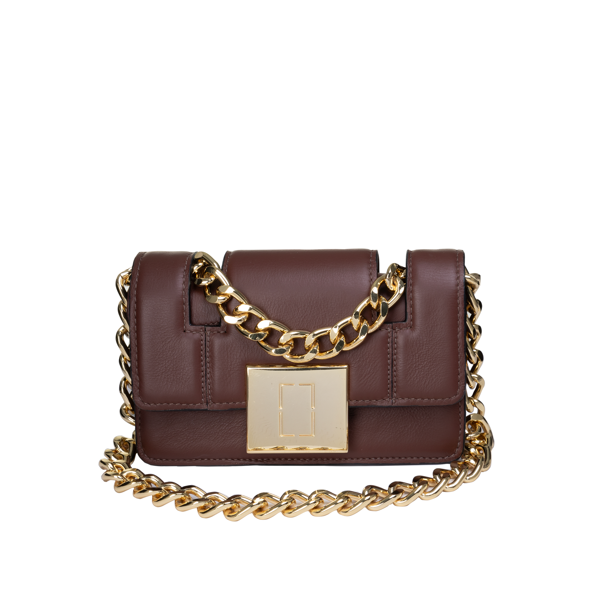 O modelo tem formato retangular, contornos arredondadas e alça tiracolo em corrente dourada. Seu fechamento é com nosso nobre fecho Louen. O acabamento do couro premium tem uma leve textura e um toque suave e acetinado. A peça é ideal para carregar seu celular, chaves, batom, cartões de crédito e dinheiro. Na capa traseira tem a gravação da marca Louen.