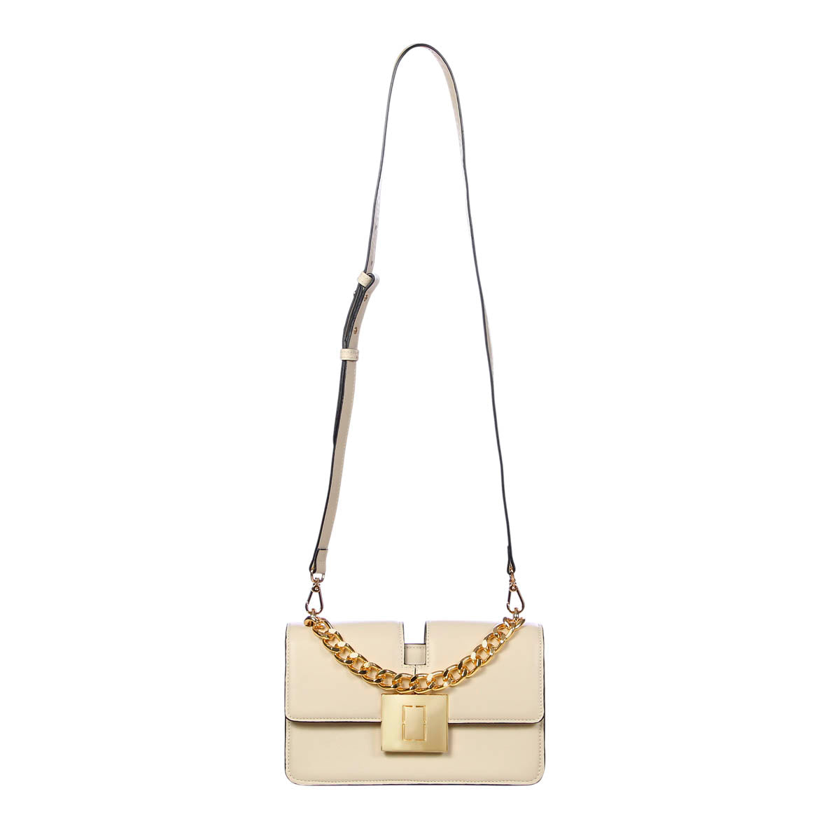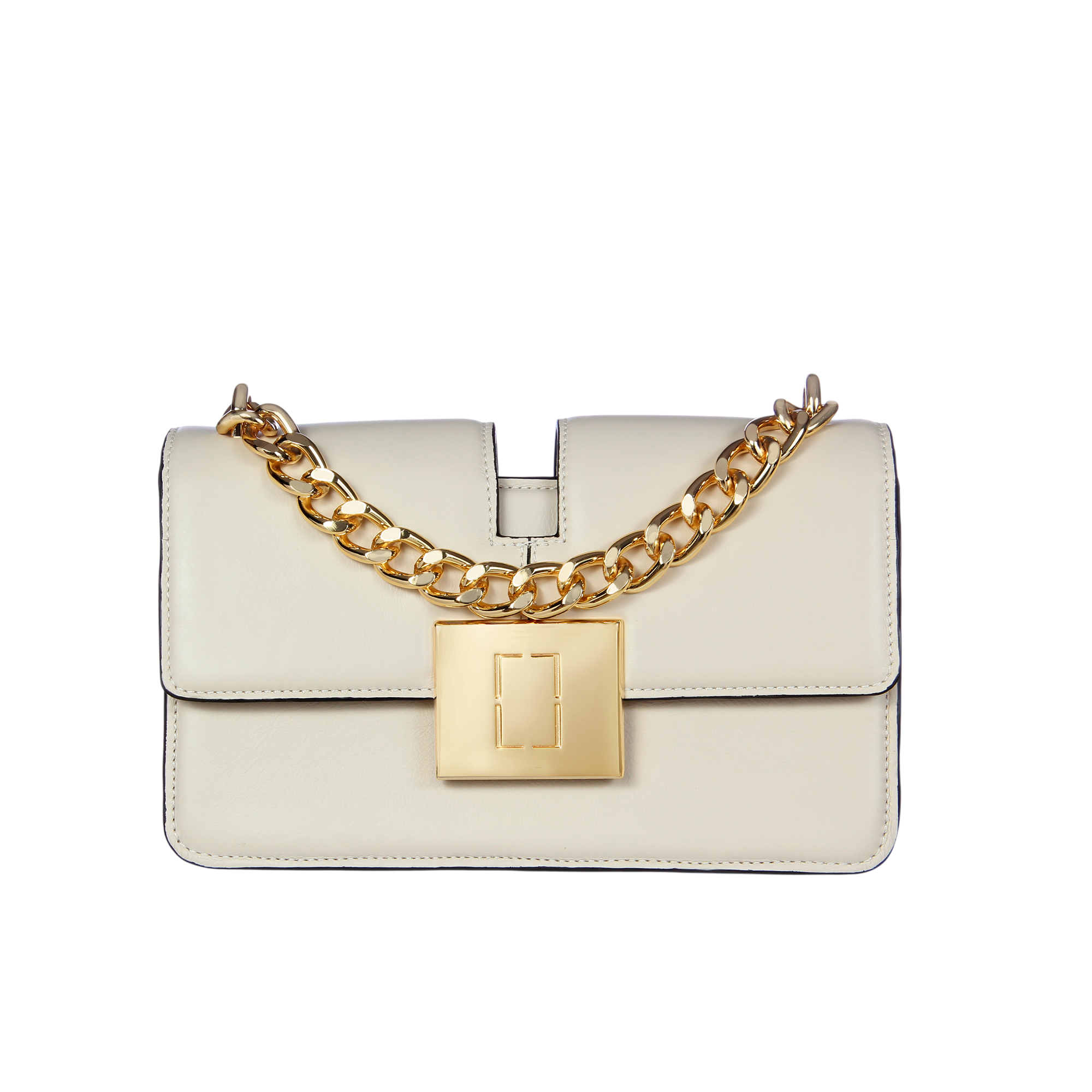 O modelo tem formato retangular, contornos arredondadas e alça de mão em corrente dourada com uma segunda alça em couro, para ser usada como tiracolo ou transversal. Seu fechamento é com nosso nobre fecho Louen.