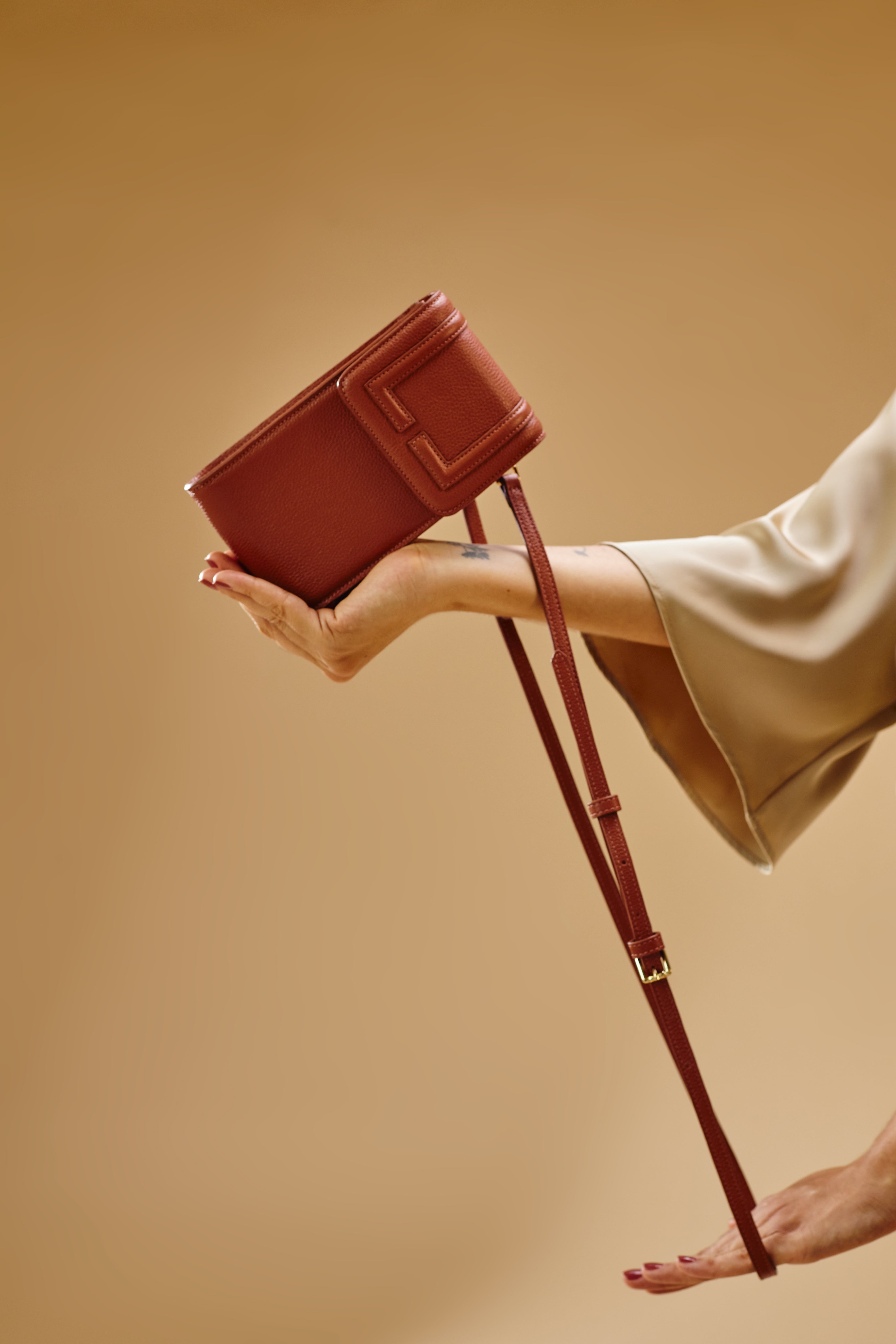 Seu design é minimalista e atemporal, com formato retangular, contornos arredondados e alça fina tiracolo, regulável e removível, que se adapta com facilidade a diferentes estilos e ocasiões.