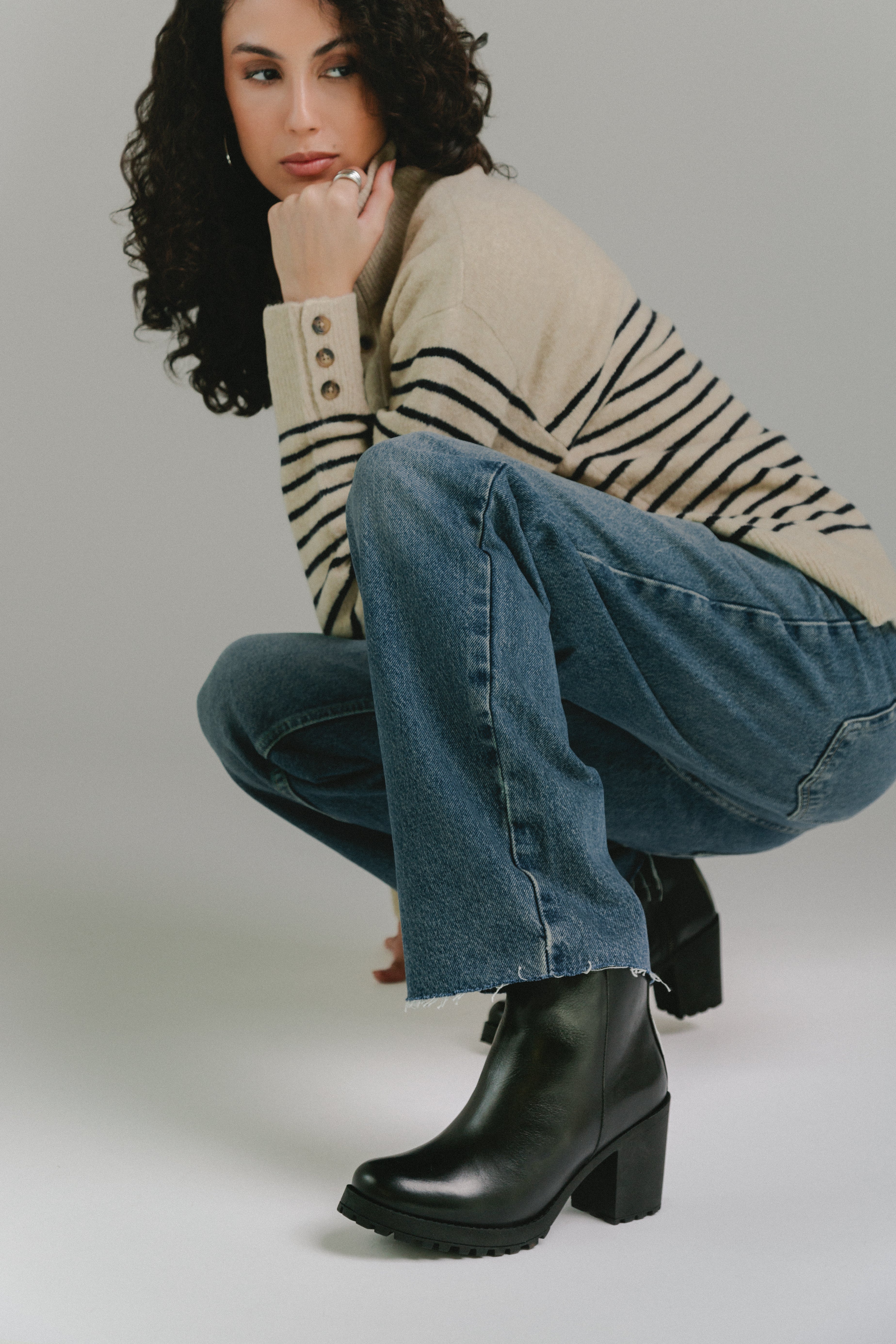Bota Isolde é ao mesmo tempo robusta e elegante pois ela combina o poder da sola tratorada com a suavidade das formas clássicas, criando uma peça com design contemporâneo. Seu cabedal em couro de origem nobre tem acabamento acetinado e toque suave, proporcionando conforto desde o primeiro uso. A sola tratorada e o  salto bloco garantem estabilidade e imponência, enquanto o puxador dourado exclusivo Louen adiciona um detalhe sofisticado e marcante. Produzida artesanalmente no Brasil, a bota Isolde reflete a tradição da Louen em produzir calçados duráveis, confortáveis e elegantes. O couro utilizado provém de curtumes certificados pelo selo internacional LWG (Leather Working Group), assegurando práticas sustentáveis e respeito ambiental.