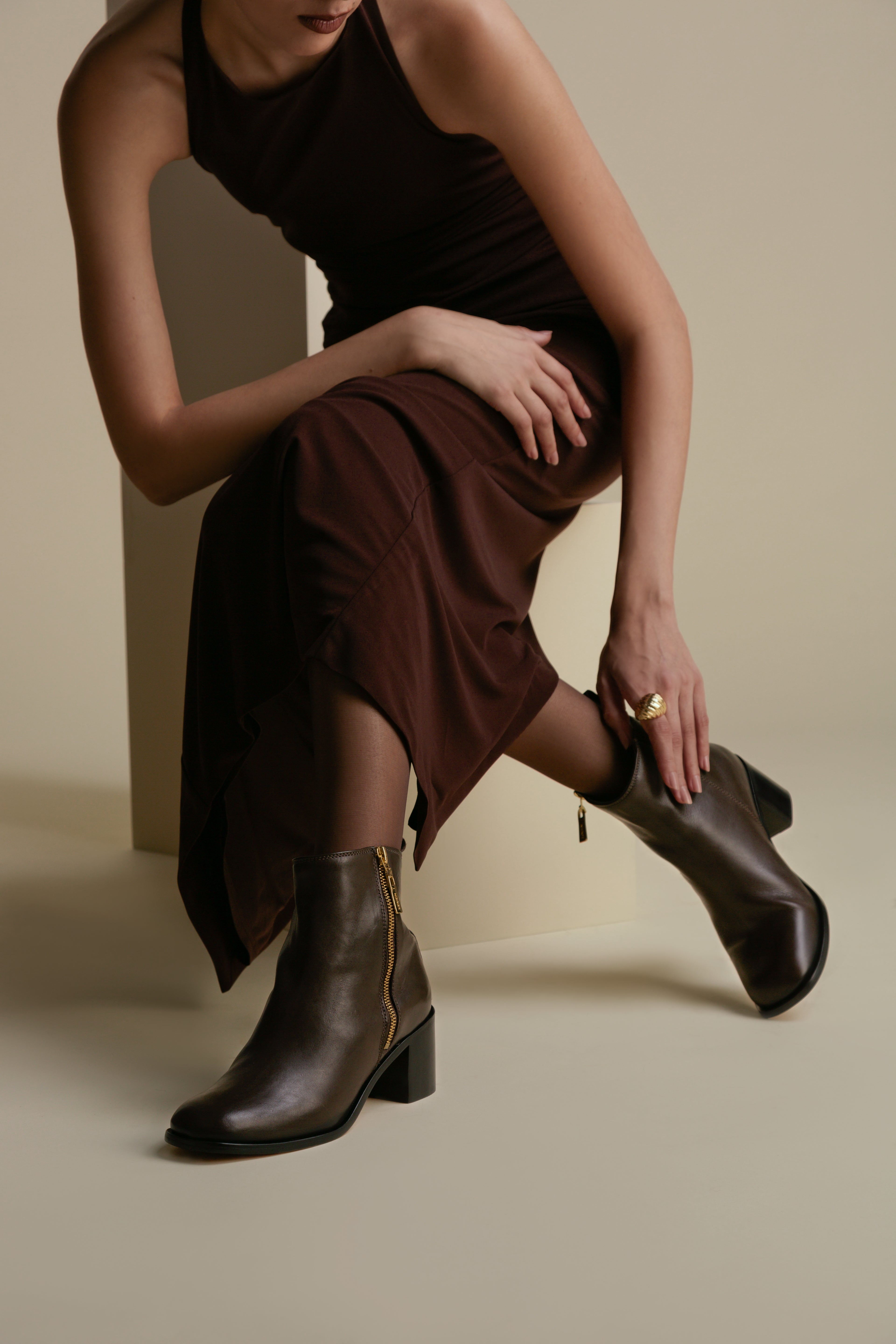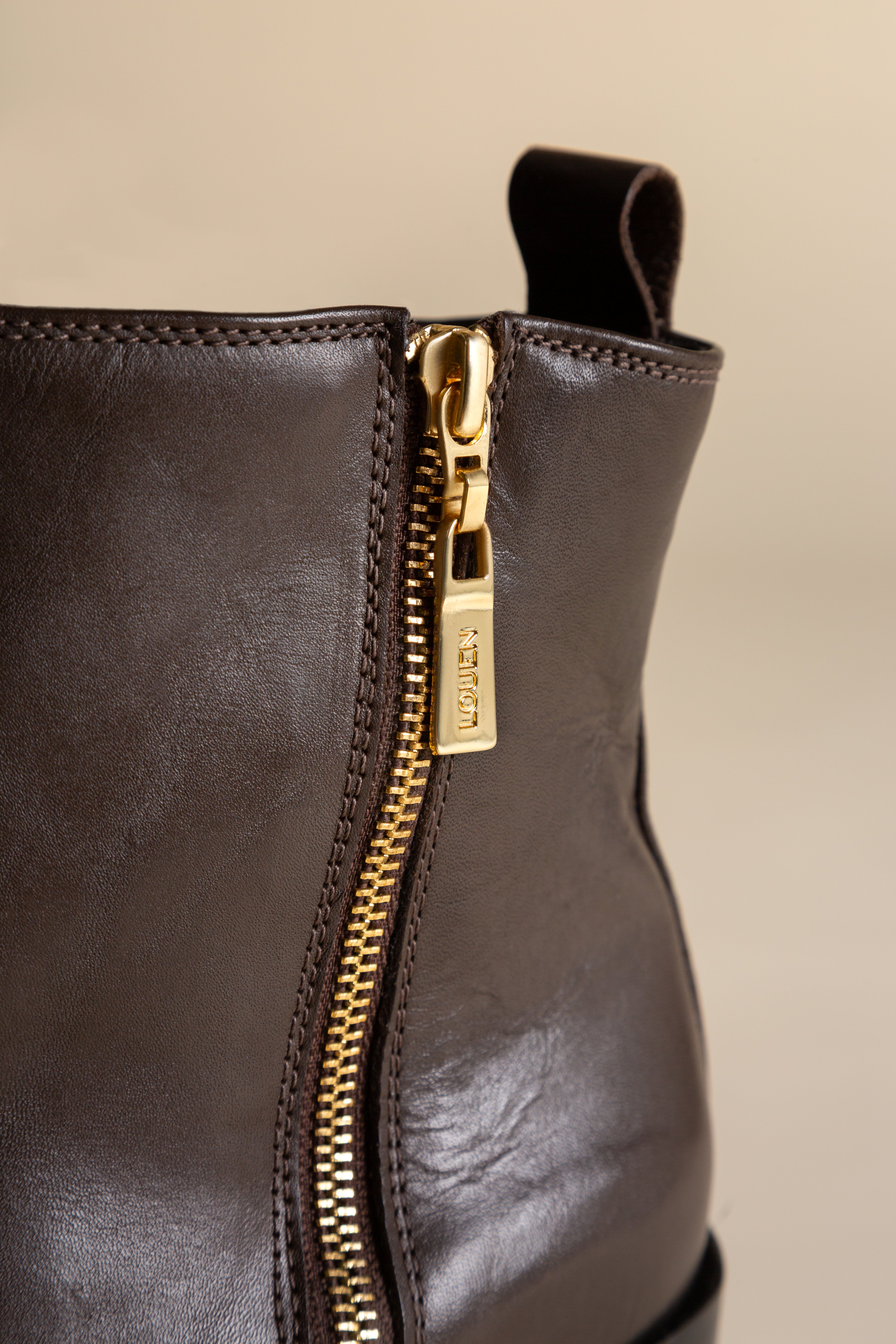 A Bota Noelle é discreta e marcante. Com linhas limpas e proporções equilibradas, ela evoca o refinamento atemporal. Seu cabedal em couro nobre, de acabamento liso e toque macio, revela a qualidade em cada detalhe. O zíper lateral dourado, com puxador exclusivo Louen, adiciona um ponto de brilho sutil e sofisticado, enquanto a sola de couro premium e o salto bloco com altura média proporcionam conforto na medida certa.