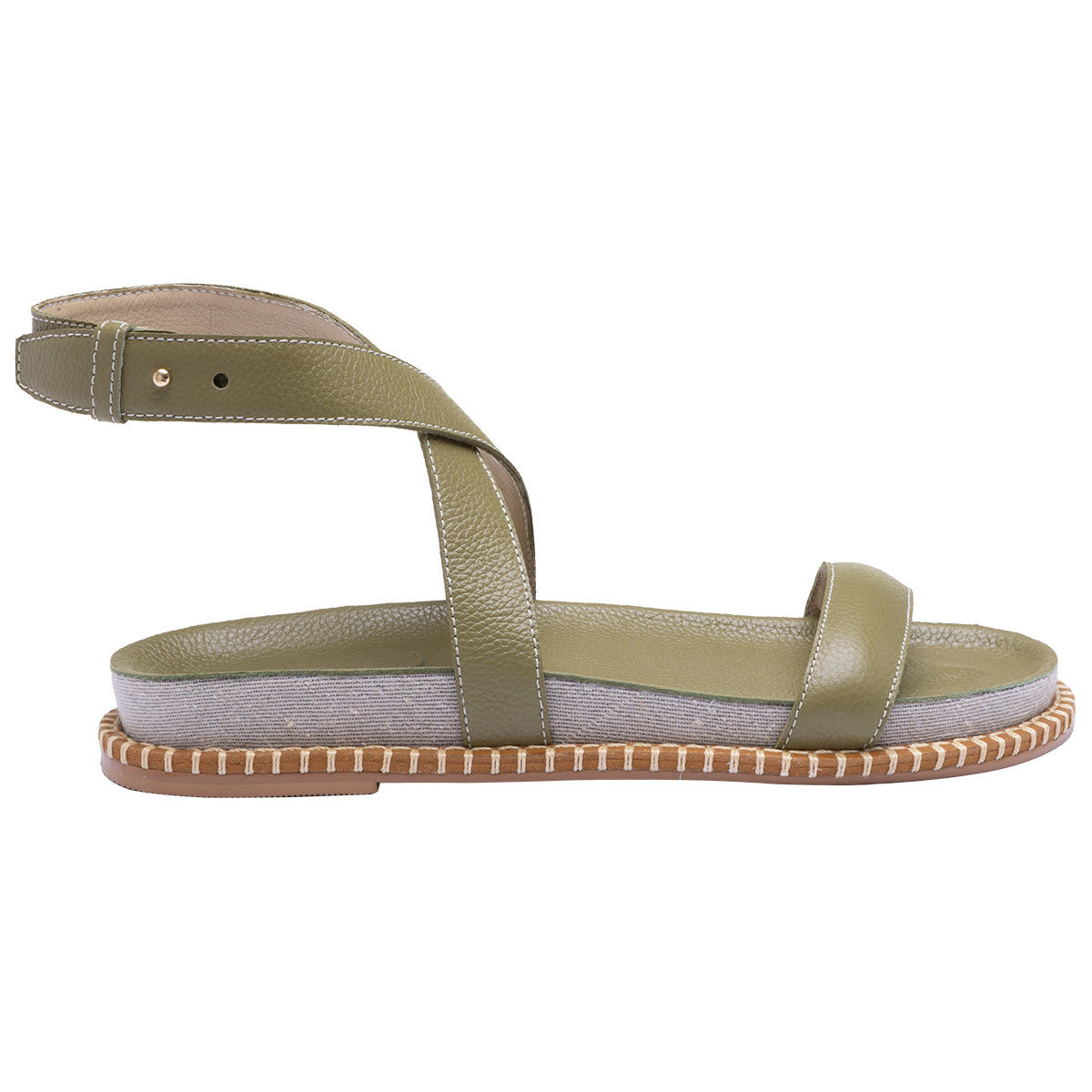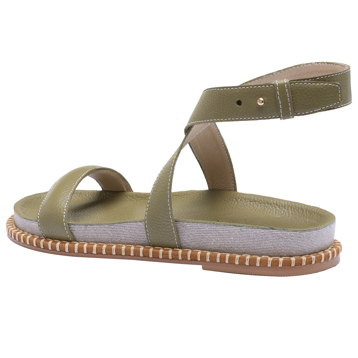 Sandália rasteira, estilo papete, elaborada em couro e linho e couro com fechamento regulável.