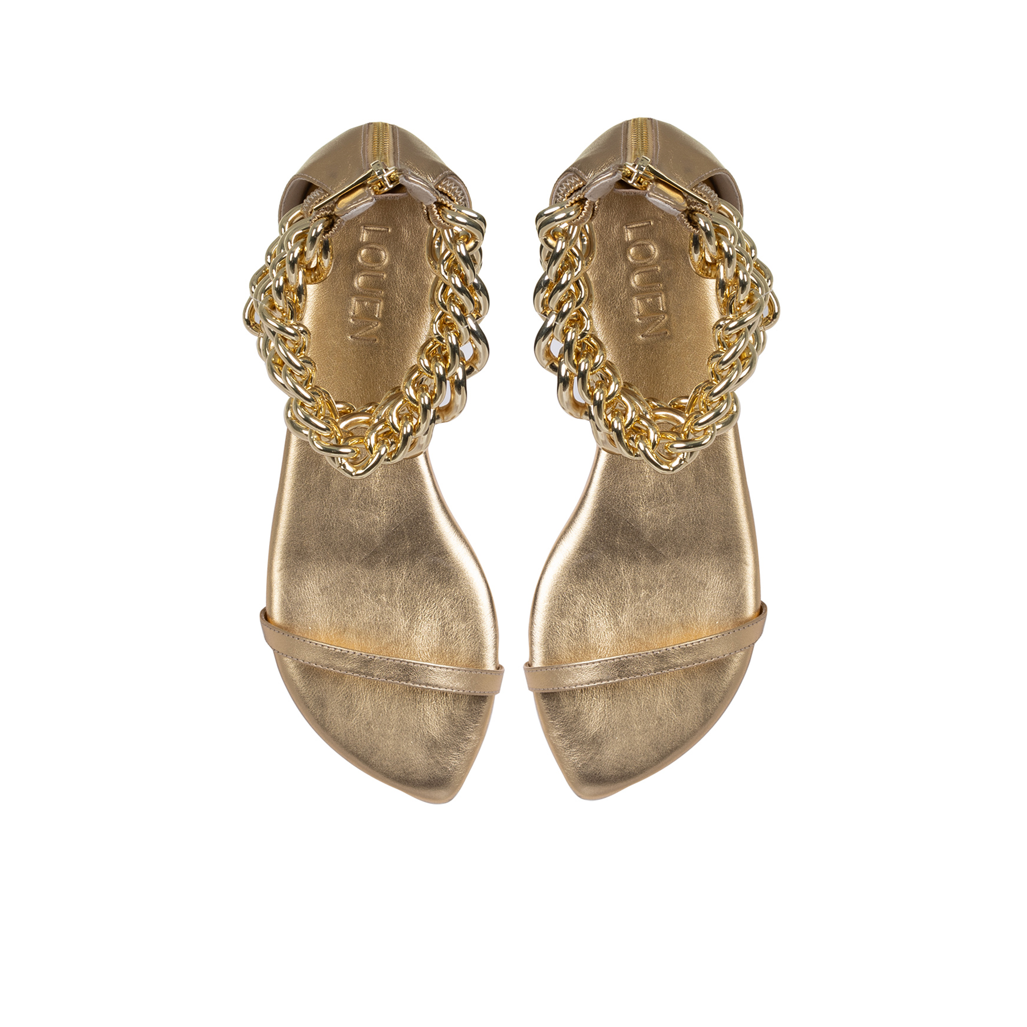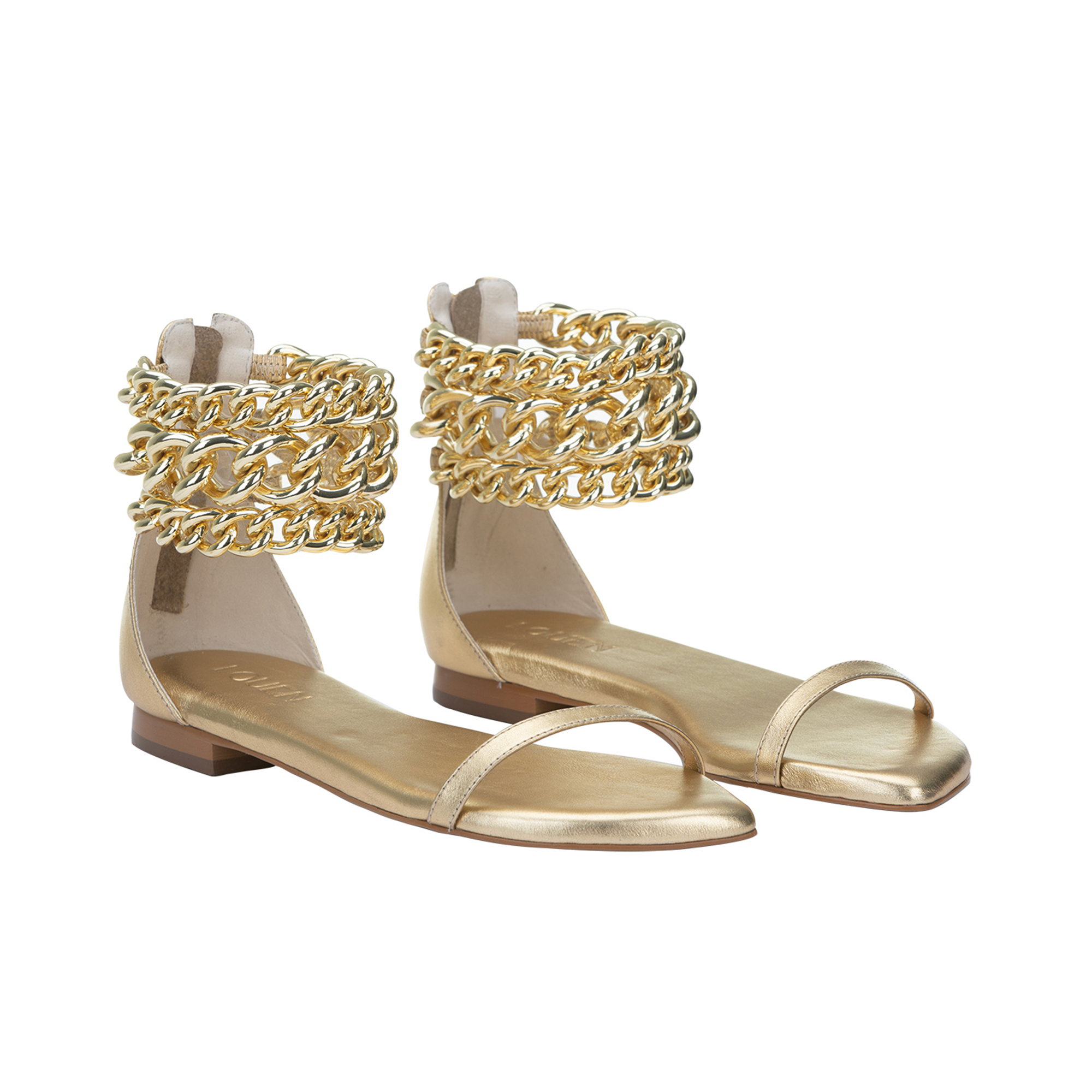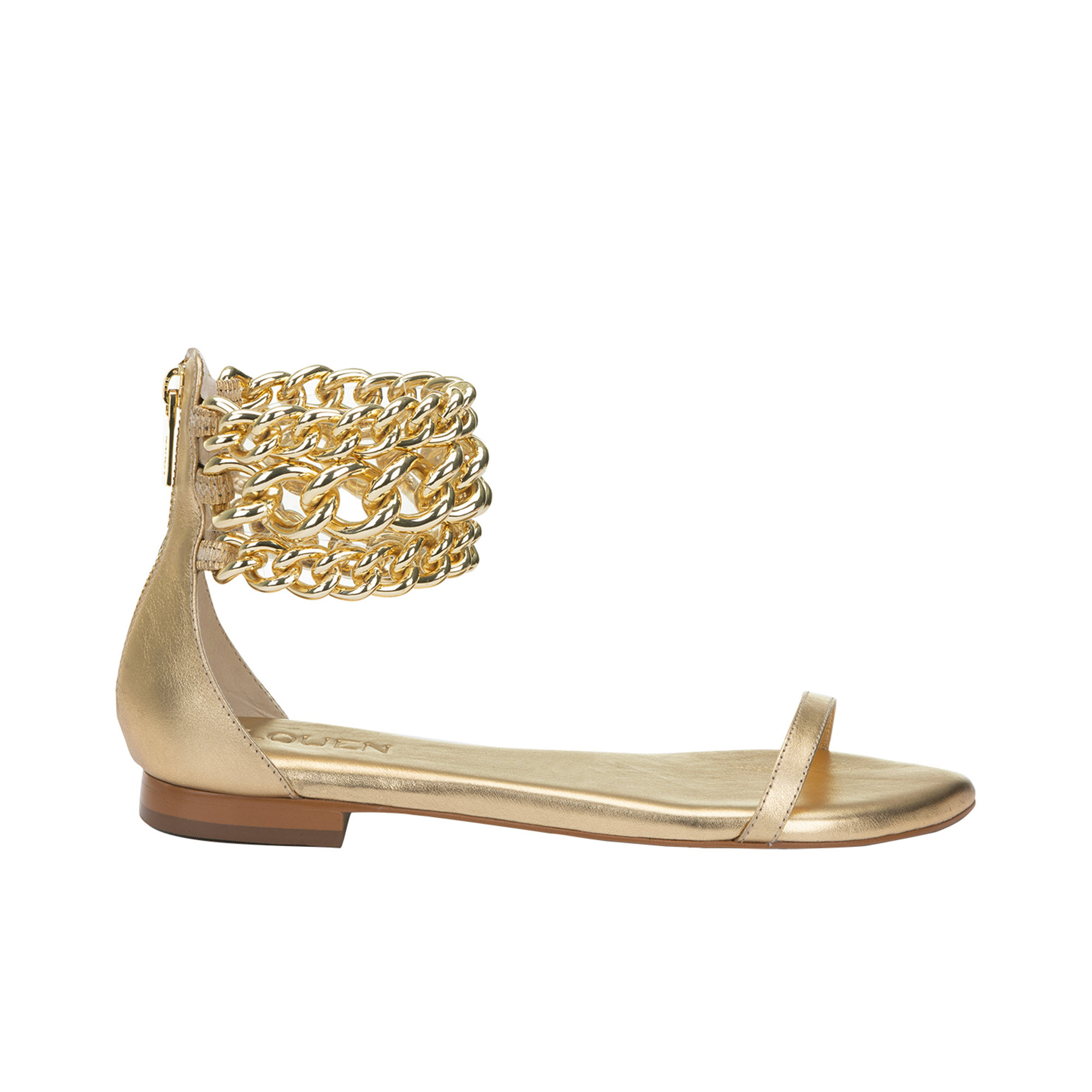 Rasteira com tira na parte dos dedos e traseira alta, com cabedal elaborado em couro com correntes douradas.