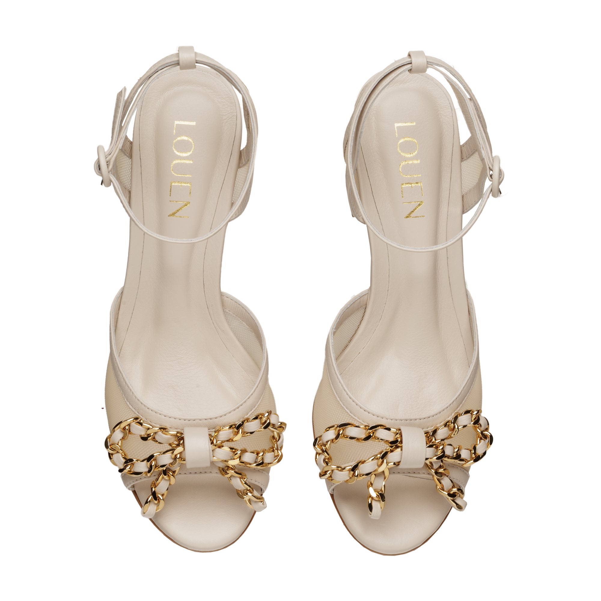 O top tem o laço de corrente entrelaçada em couro e a traseira com abotoar no tornozelo tornam o modelo extremamente delicado, alinhado à tendência da transparência. O salto bloco médio/baixo de 4,5 cm, também forrado em couro, contribui para uma silhueta alongada e discreta, ideal para ocasiões formais ou looks mais sutis do dia a dia.