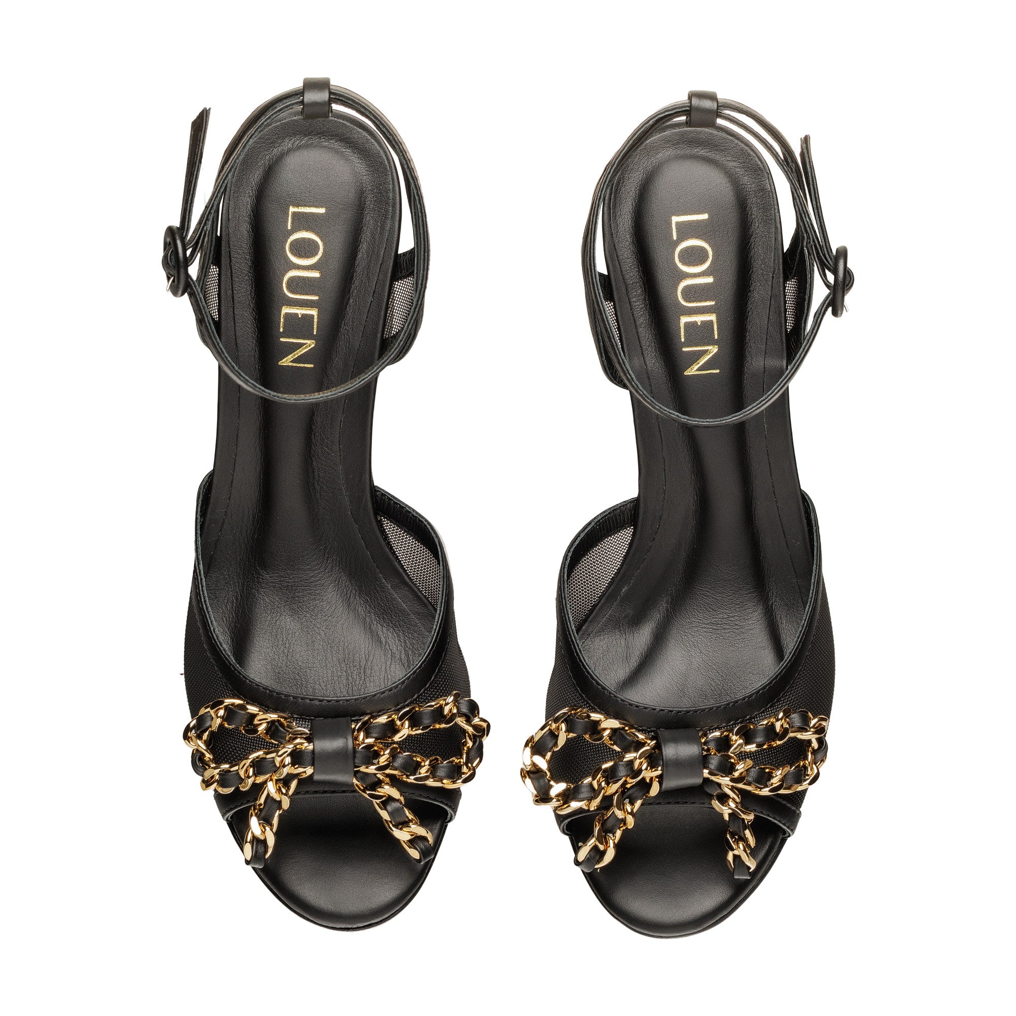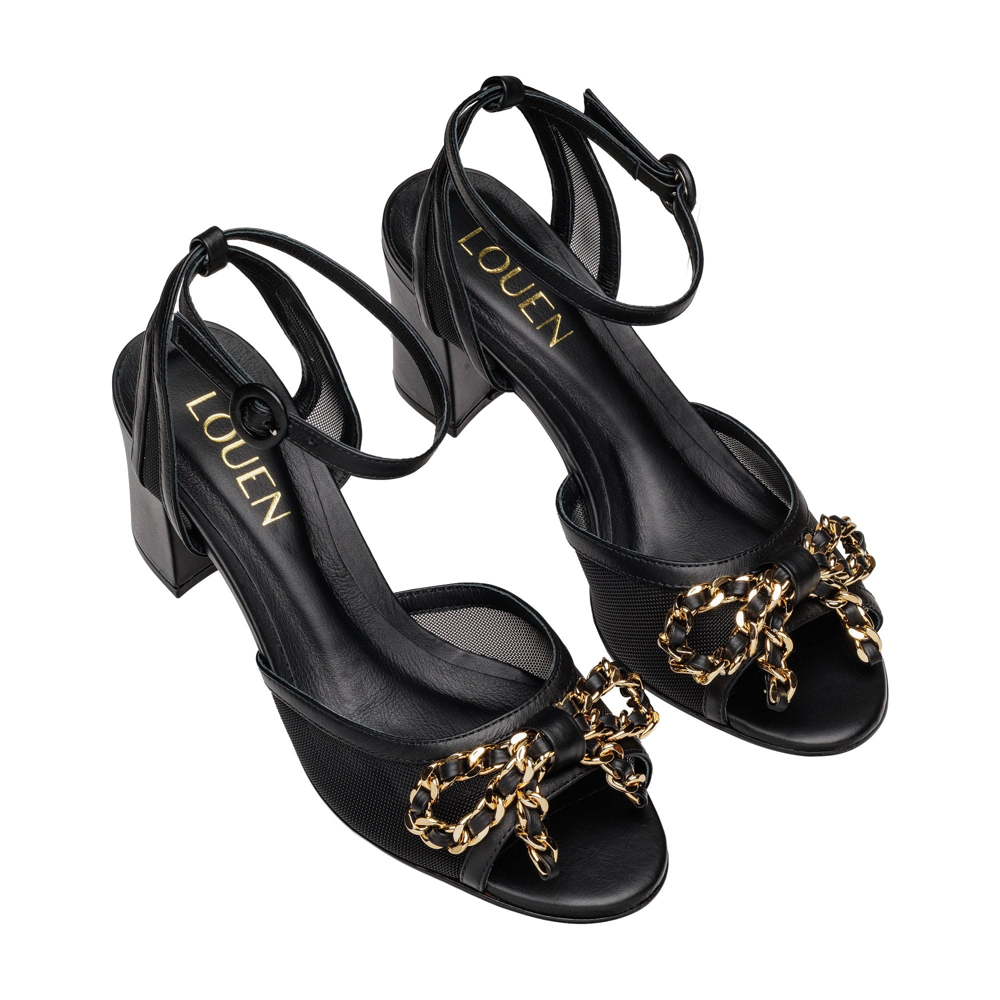 O top tem o laço de corrente entrelaçada em couro e a traseira com abotoar no tornozelo tornam o modelo extremamente delicado, alinhado à tendência da transparência. O salto bloco médio/baixo de 4,5 cm, também forrado em couro, contribui para uma silhueta alongada e discreta, ideal para ocasiões formais ou looks mais sutis do dia a dia.