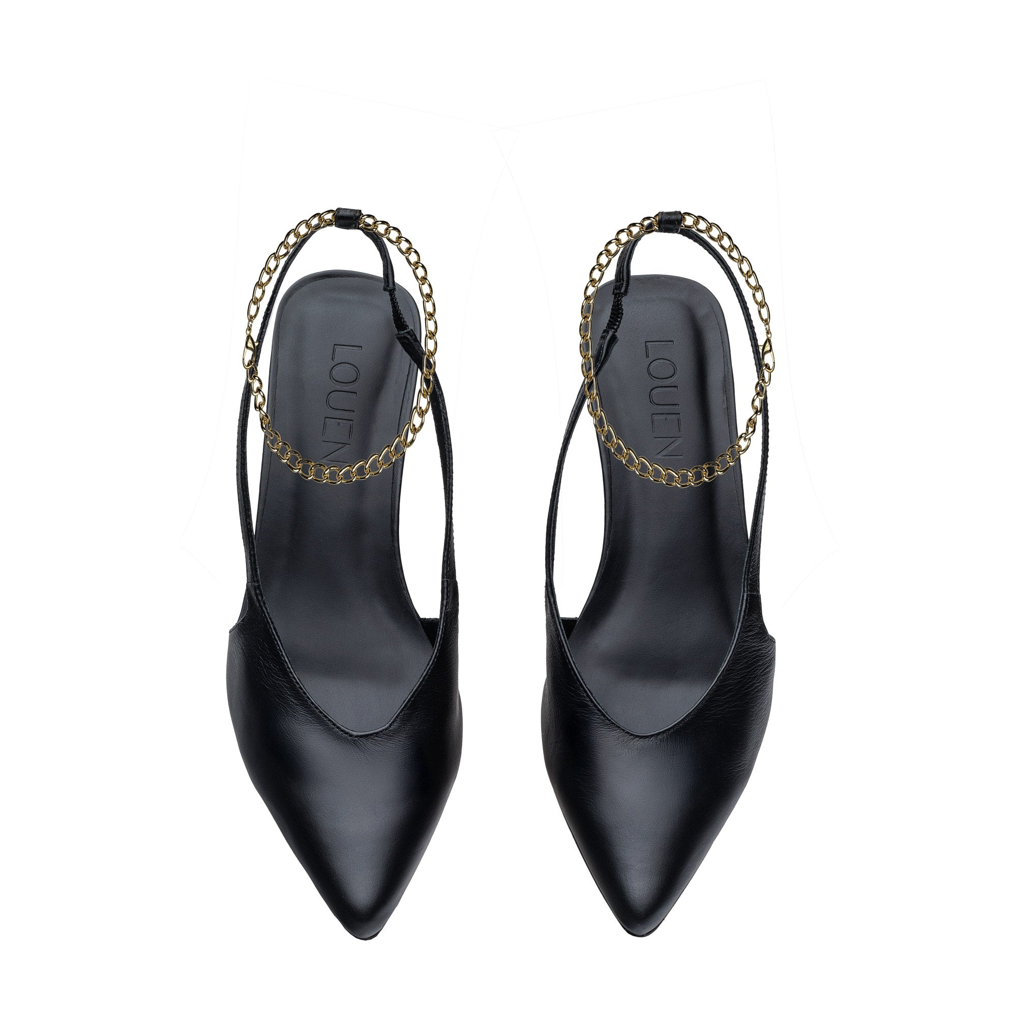 O scarpin Slingback Celine foi elaborado para reunir leveza, sofisticação e sensualidade. O cabedal em couro, combinado ao metalizado dourado aplicado na corrente e no salto, confere brilho especial a este elegante produto. A sola em couro, símbolo de nobreza na sapataria, abriga a placa metálica da Louen e apresenta um salto de 5,5 cm com acabamento em borracha antiderrapante, pensado para oferecer conforto, estabilidade e resistência.