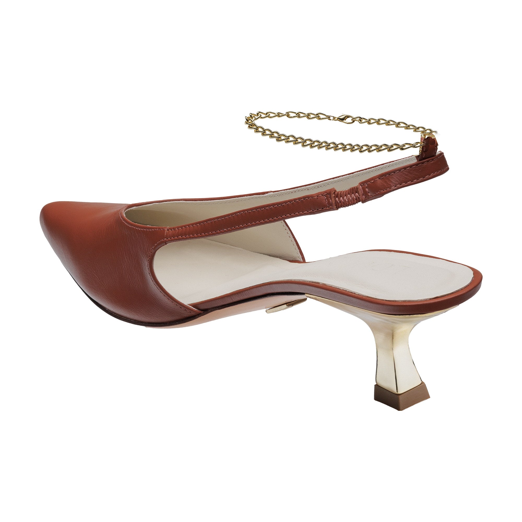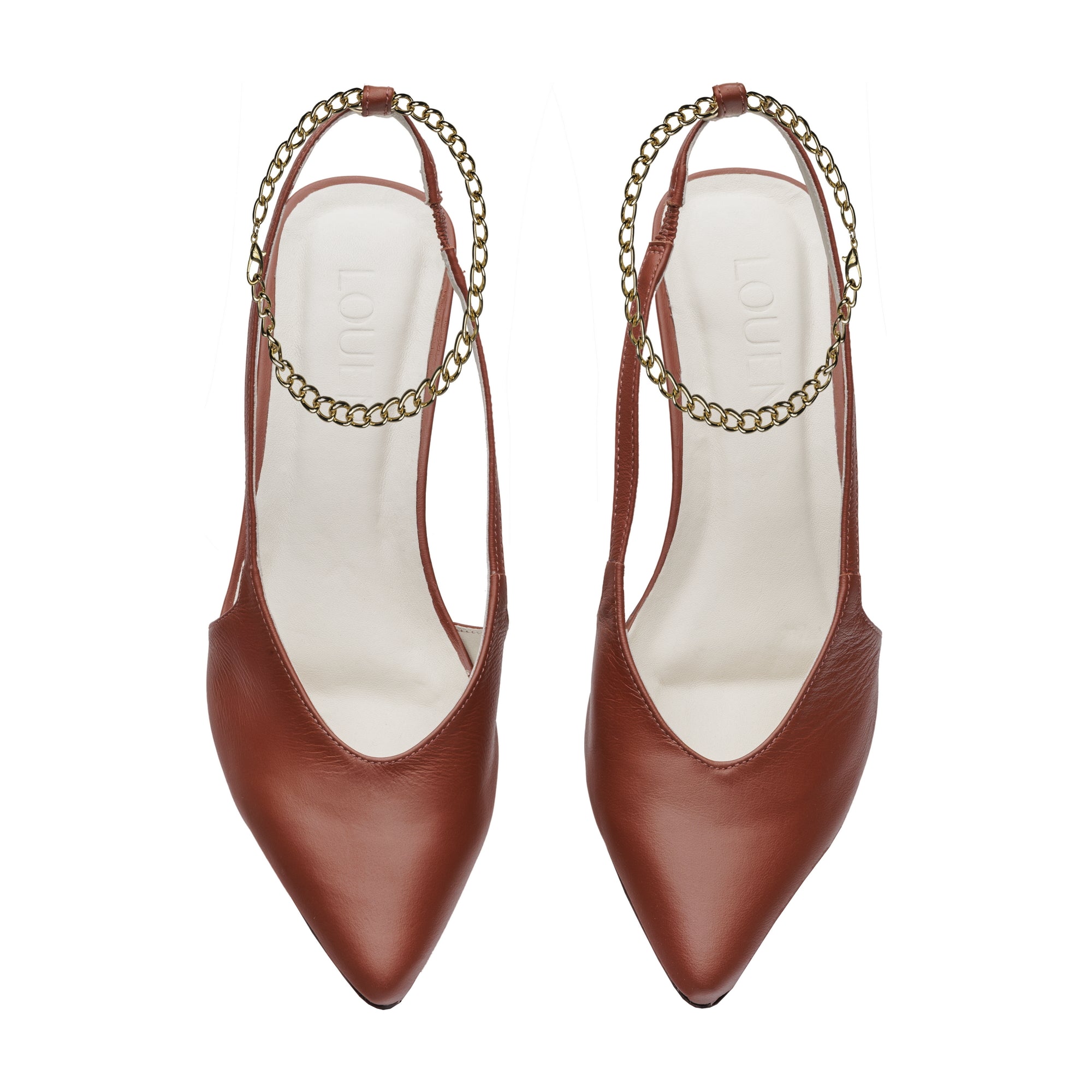 O scarpin Slingback Celine foi elaborado para reunir leveza, sofisticação e sensualidade. O cabedal em couro, combinado ao metalizado dourado aplicado na corrente e no salto, confere brilho especial a este elegante produto. A sola em couro, símbolo de nobreza na sapataria, abriga a placa metálica da Louen e apresenta um salto de 5,5 cm com acabamento em borracha antiderrapante, pensado para oferecer conforto, estabilidade e resistência.
